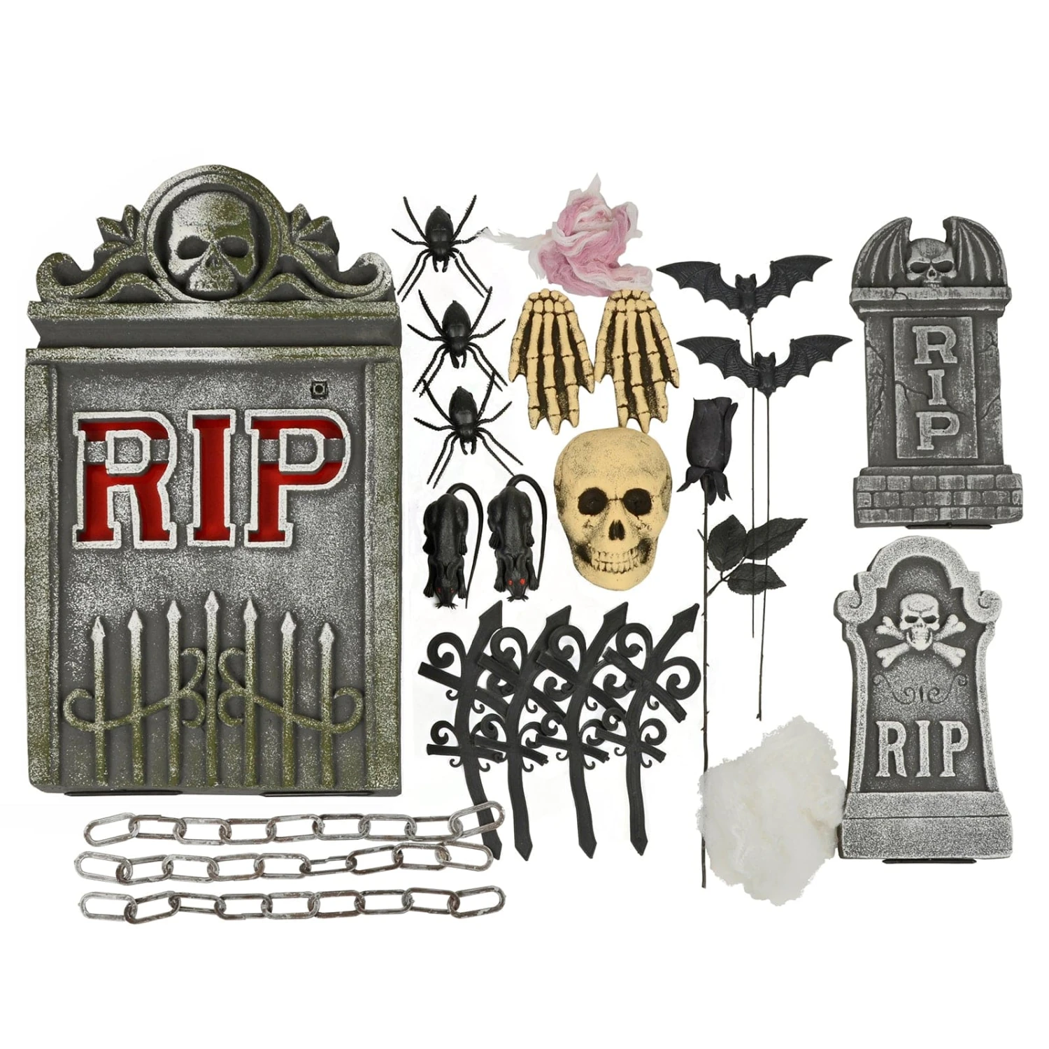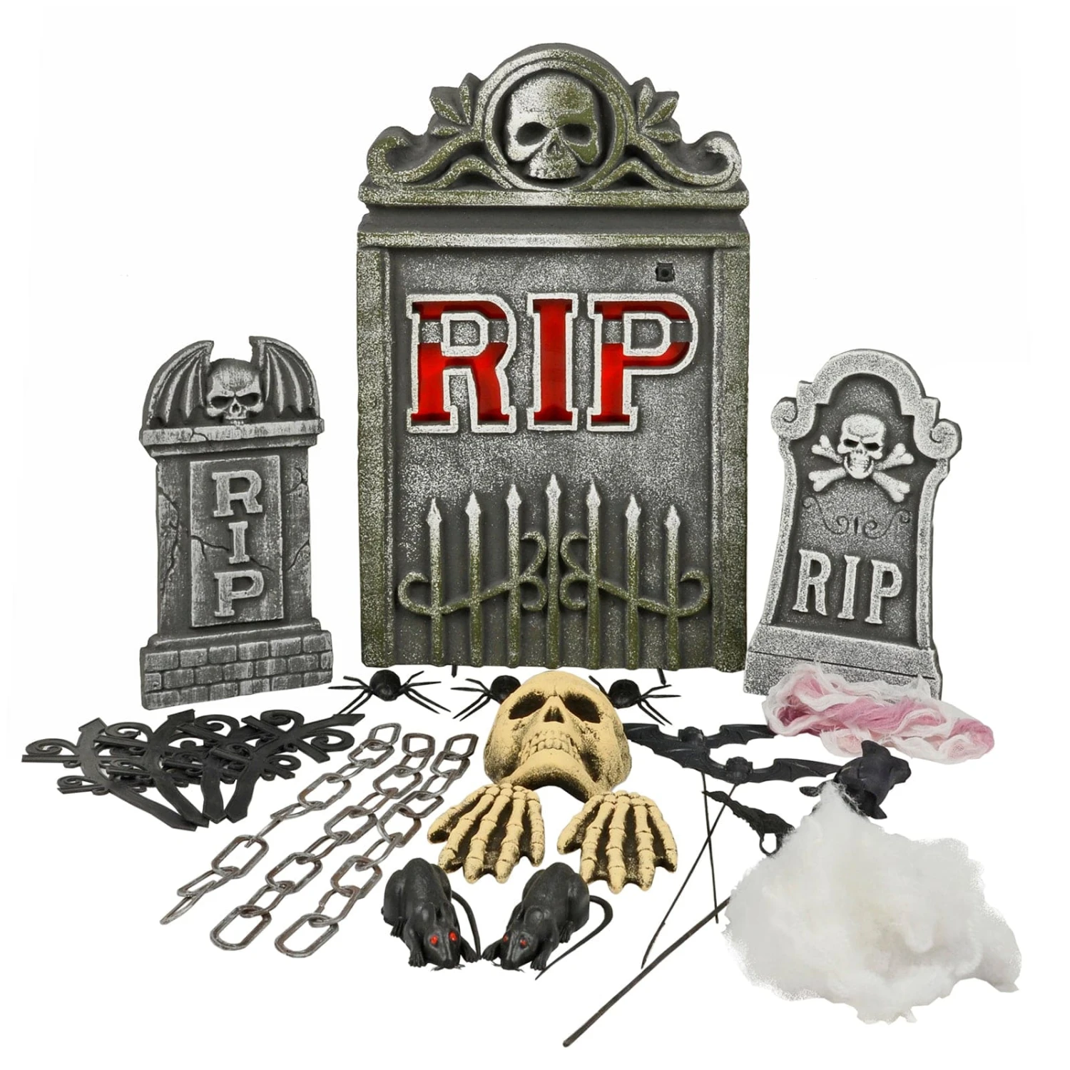 Set contains: 1 x large tombstone with LED lights, 2 x small tombstone, 2 x bat with stake, 1 x black rose with stake, 4 x fence decoration, 3 x chain, 1 x white cloth with blood, 3 x spider, 2 x rat, 2 x skeleton hand, 1 x skull and 1 x white netting