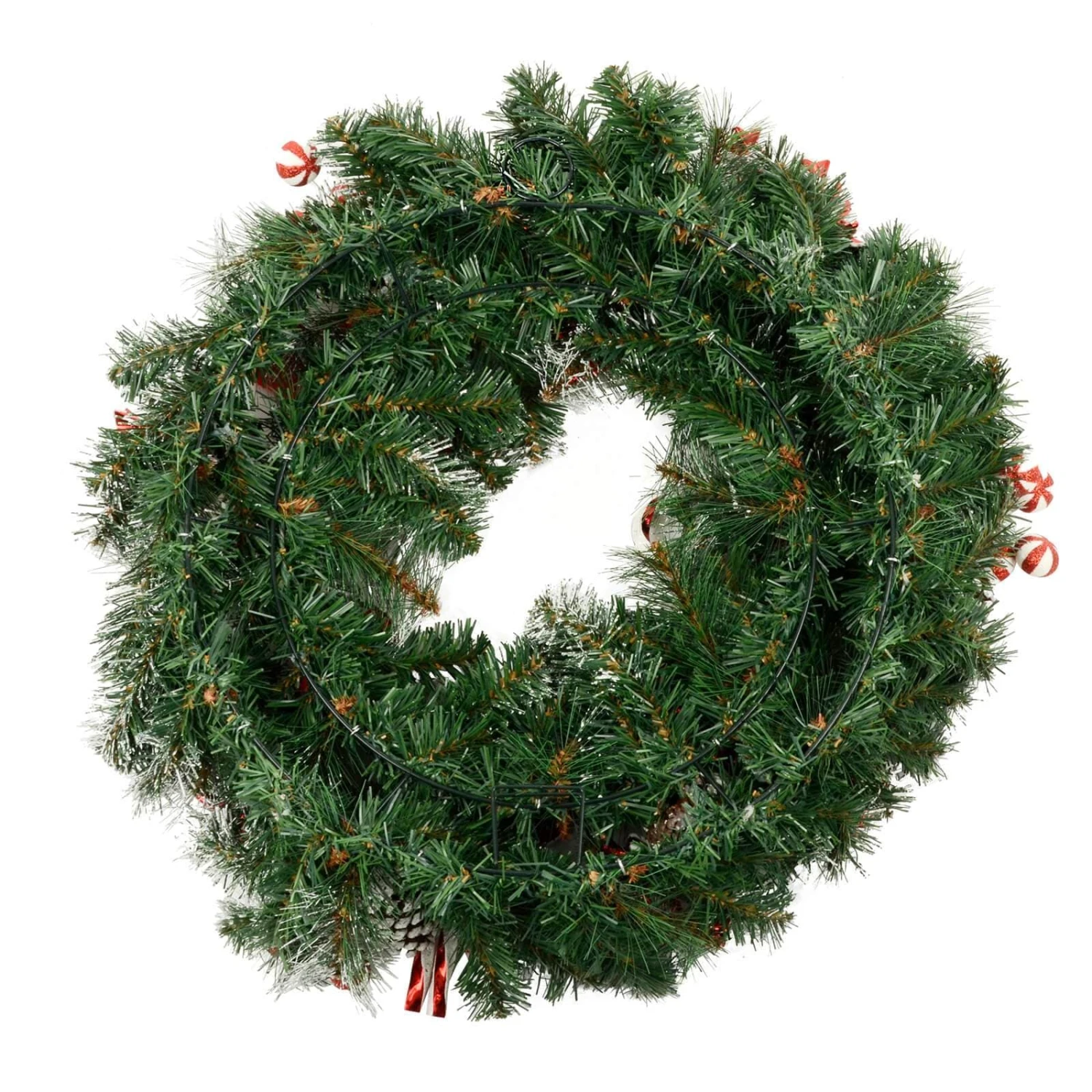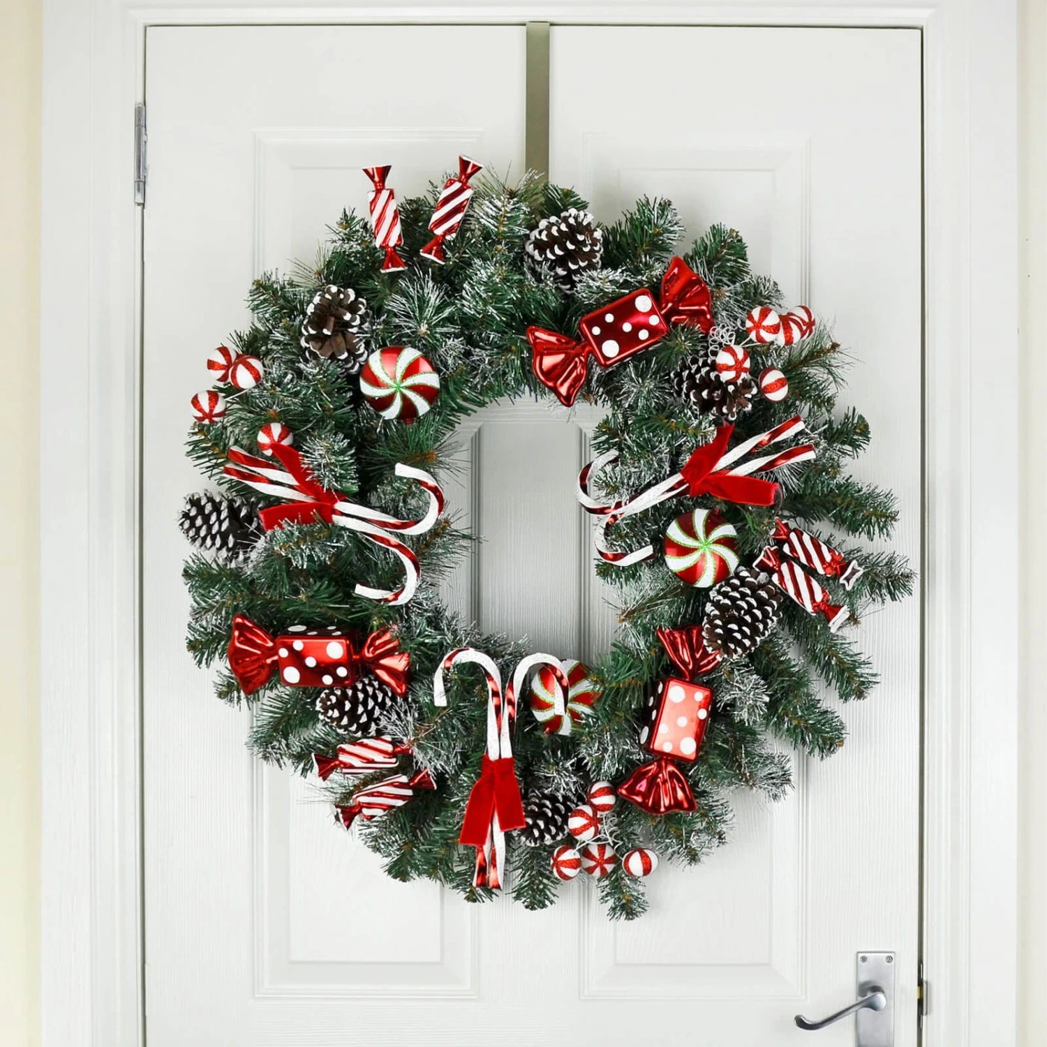 The green, artificial mixed pine foliage has a snow effect finish and the big pine cones are tipped with silver glitter. The large Christmas wreath is decorated with red and white stripe candy canes, wrapped sweets, swirl lollipops and more. It will look stunning on your door or above your fireplace over the festive season!