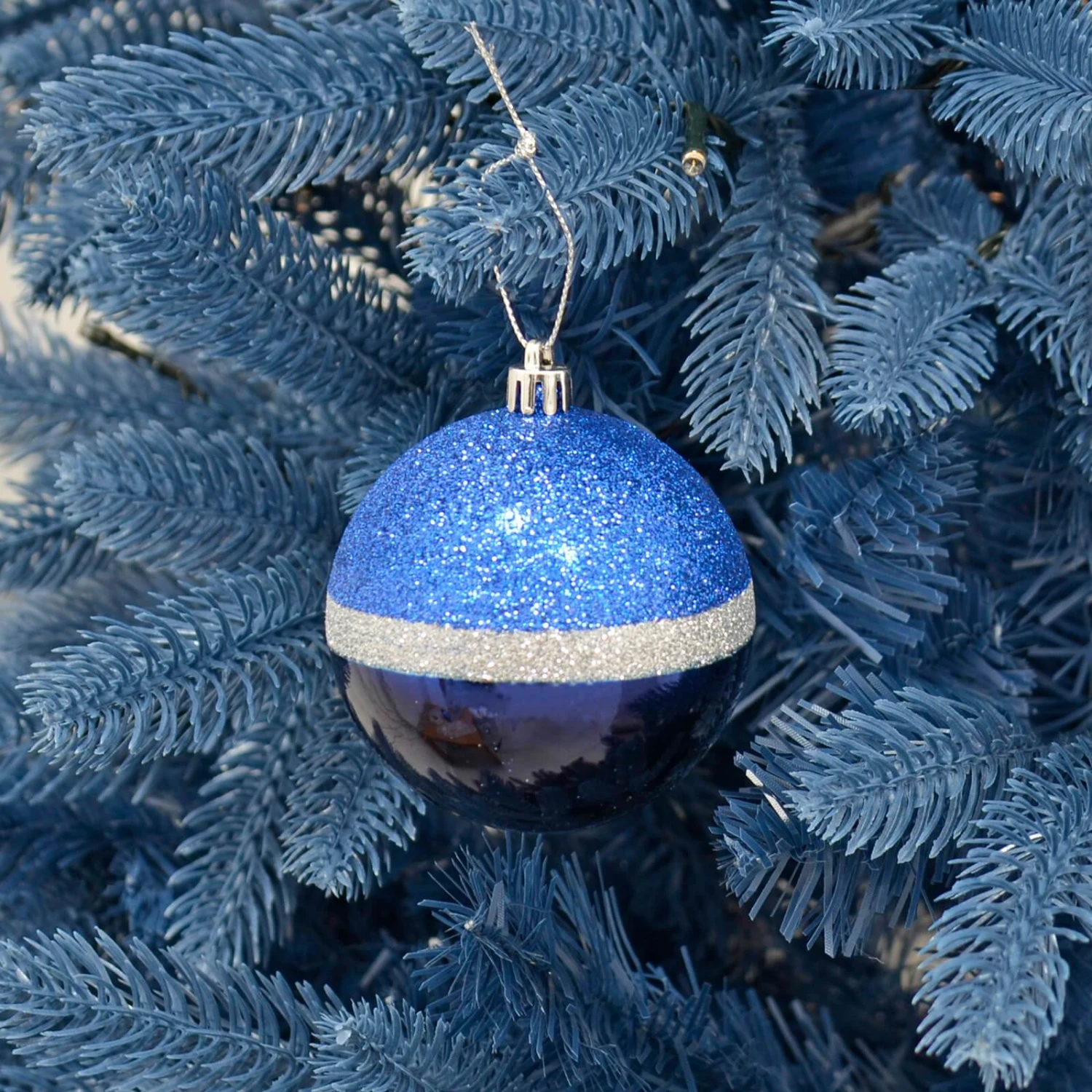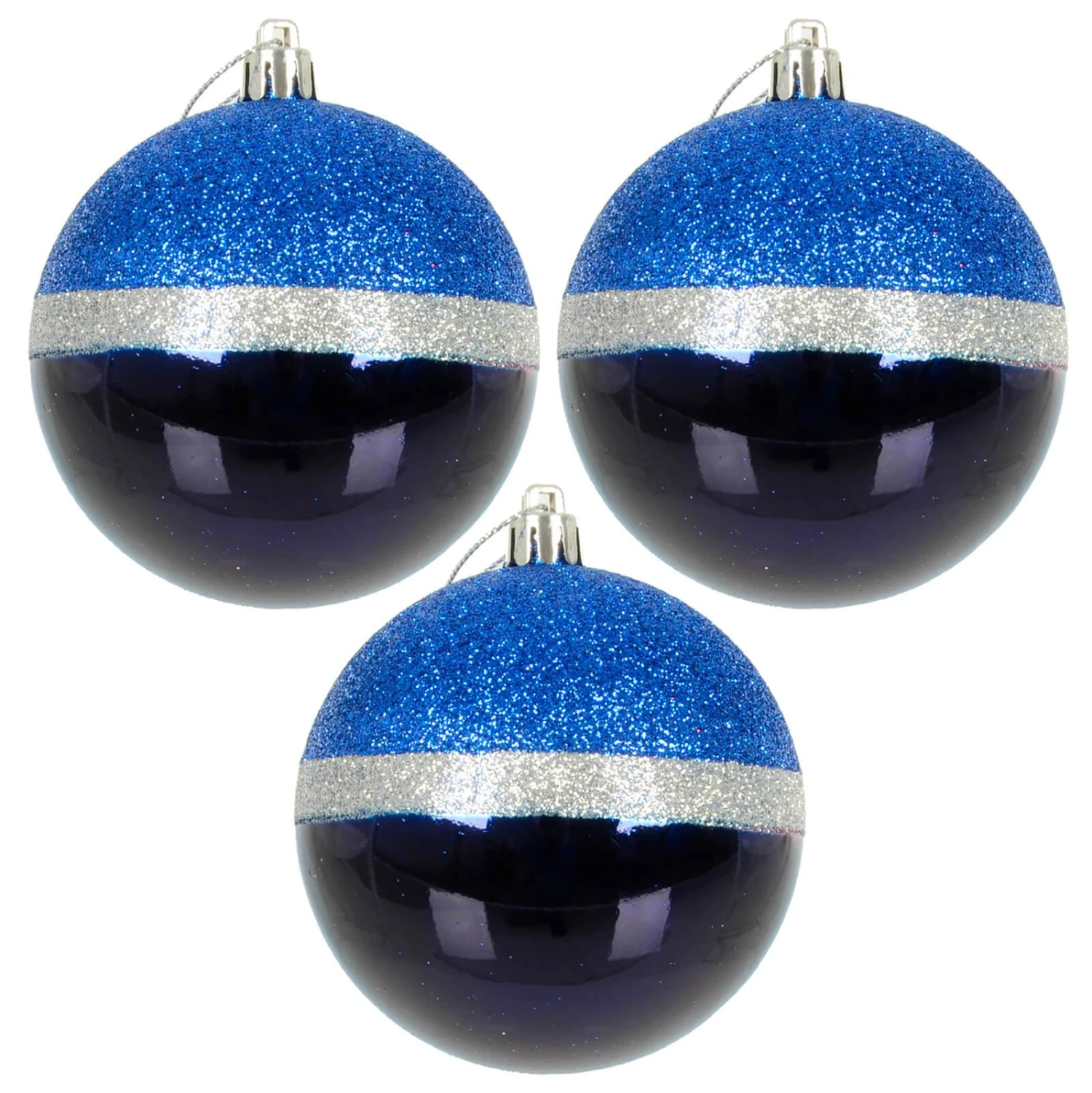 This pack contains 3 blue, navy and silver round Christmas tree baubles with glitter and gloss finish. The baubles are ;8cm in diameter, made from durable plastic and come with silver cap and hanging loop. Perfect for your silver and blue themed Christmas decor.