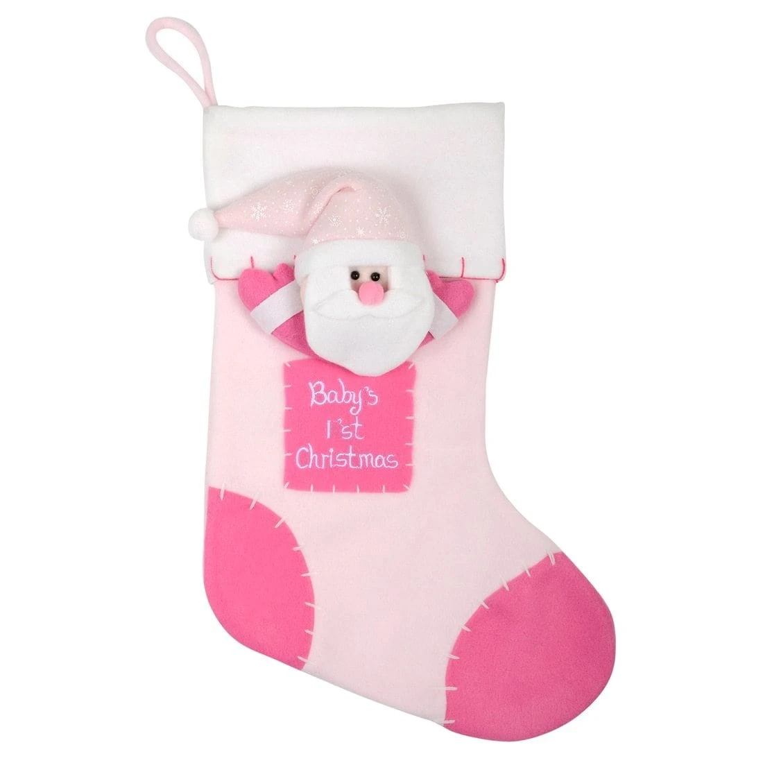 Celebrate baby’s first Christmas with this festive stocking. Made from soft pink fleece fabric, it features an adorable 3D Santa character and embroidered “Baby’s 1st Christmas” text on the front.