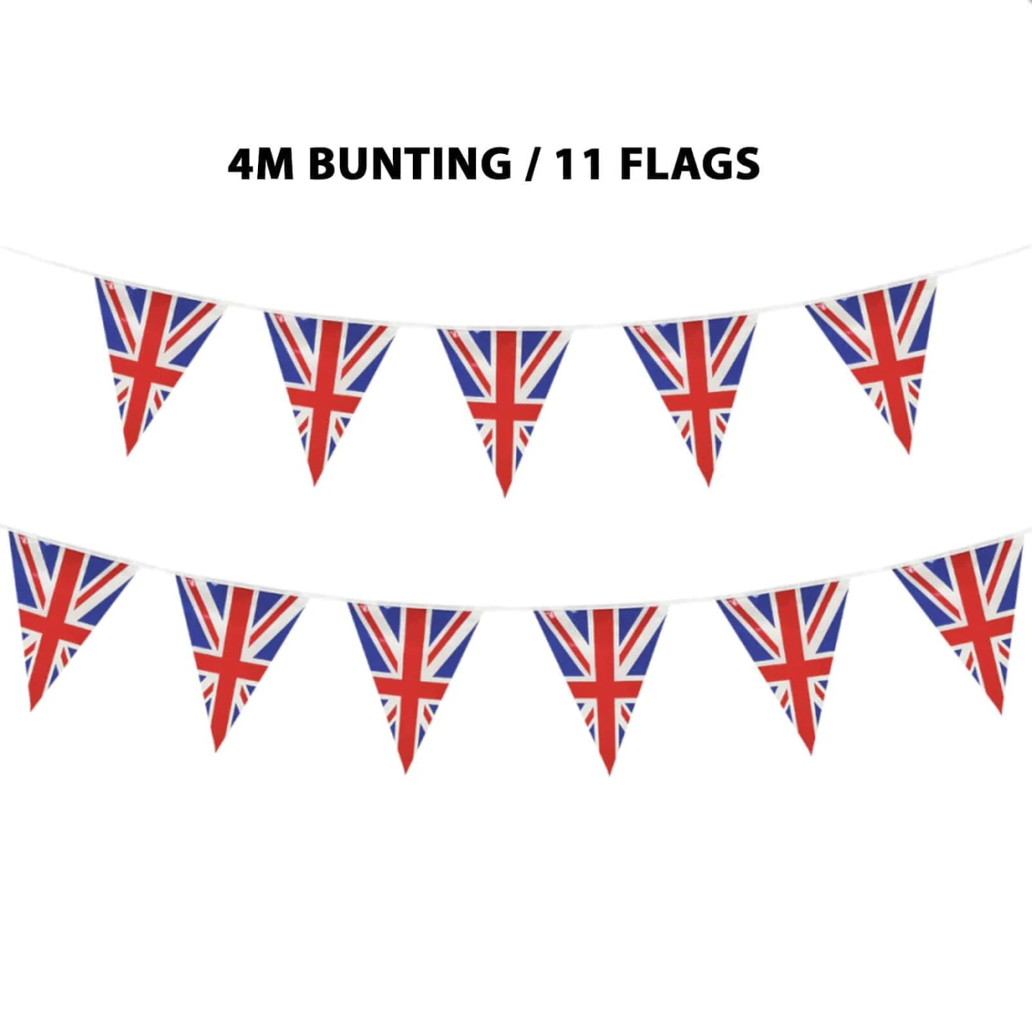 The string of Great Britain flag bunting is 4m long with 11 triangle shape flags. Each flag measures 31cm x 20cm.
