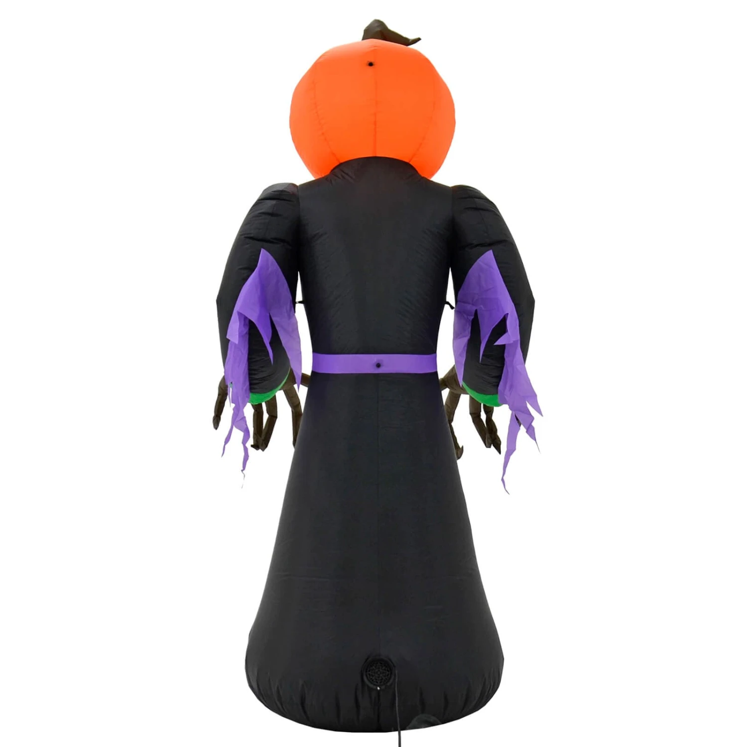 The light up inflatable Halloween decoration features a monster with pumpkin head, long claw fingers and a purple fringe black robe. The Halloween inflatable is lit by 2 white LED lights and is 2m (6.5ft) high. Suitable for indoor and outdoor use
