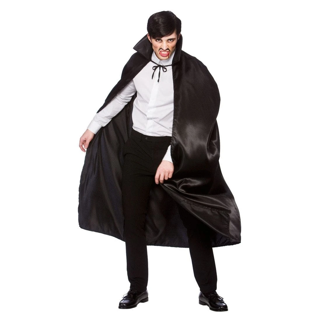This long black satin cape features a stand-up collar and ties at the neck and is ideal for many costumes including vampires, superheroes, witches and wizards!