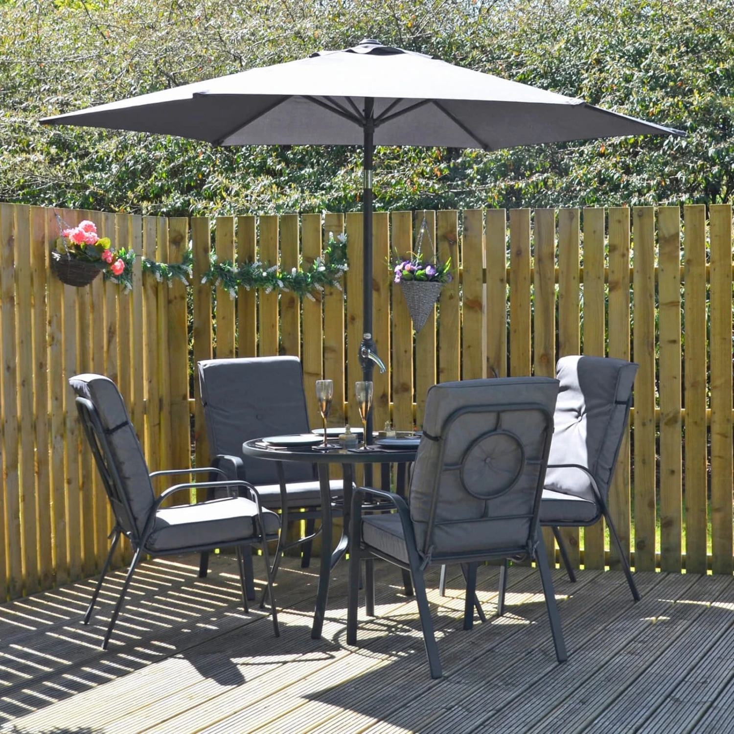 • 4 x chairs, 1 x dining table and 1 x tilting parasol