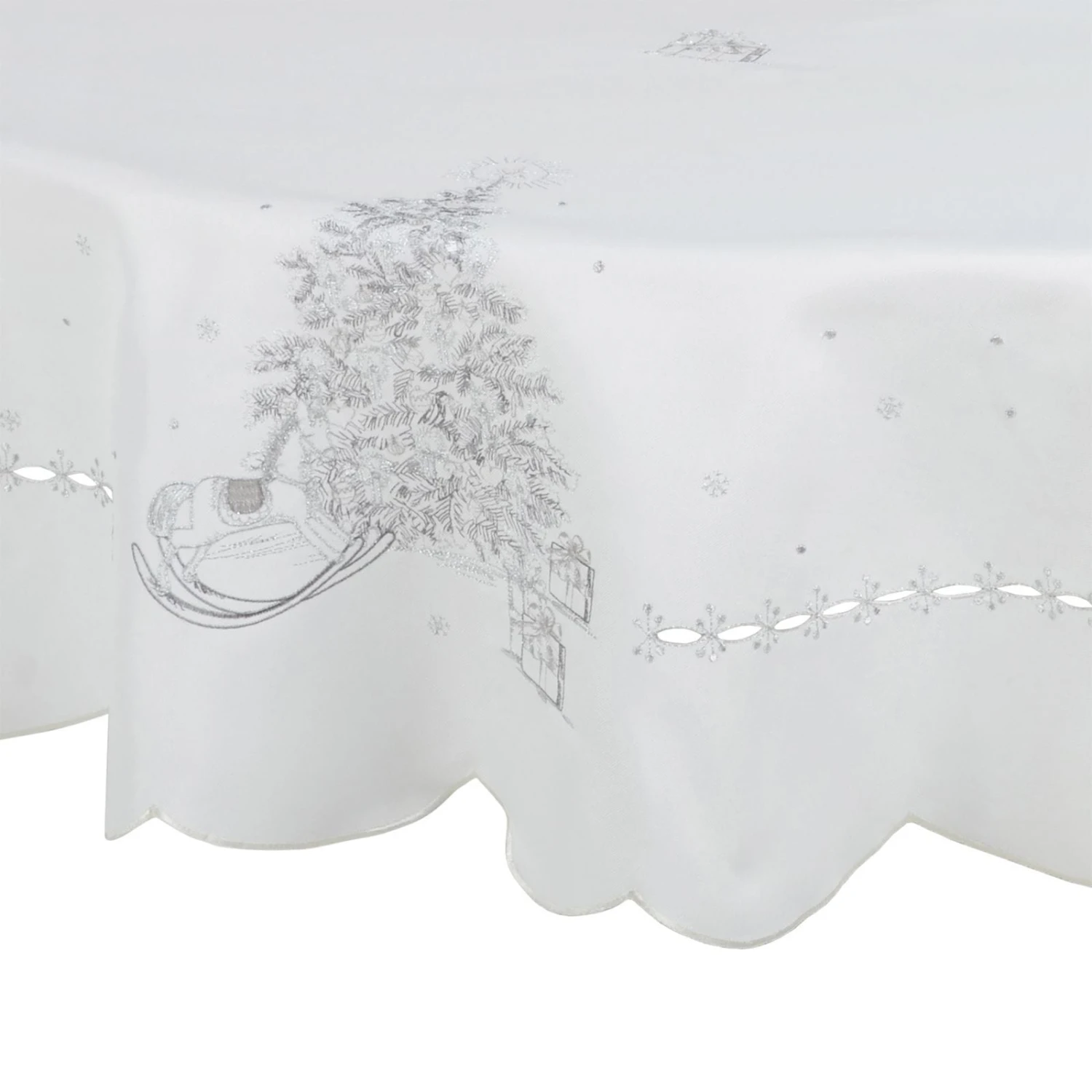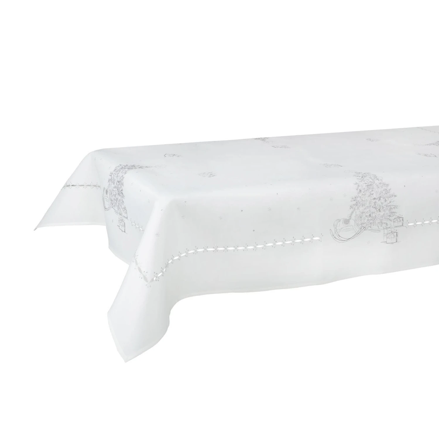 The white tablecloths feature embroidered Christmas trees, presents and other Christmassy details. The design is available in black and white or in red and green.