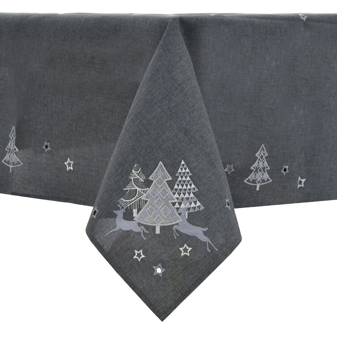 These beautiful fabric tablecloths and napkins have white and silver embroidered Christmas trees and reindeer on a dark grey background. The xmas tablecloths are available in 3 sizes – 52×72″ and 52×90″ for rectangular tables and 70″ diameter for round tables. The matching fabric Christmas napkins are 16″ square and come in a pack of 4. Create the perfect setting for your Christmas celebrations!