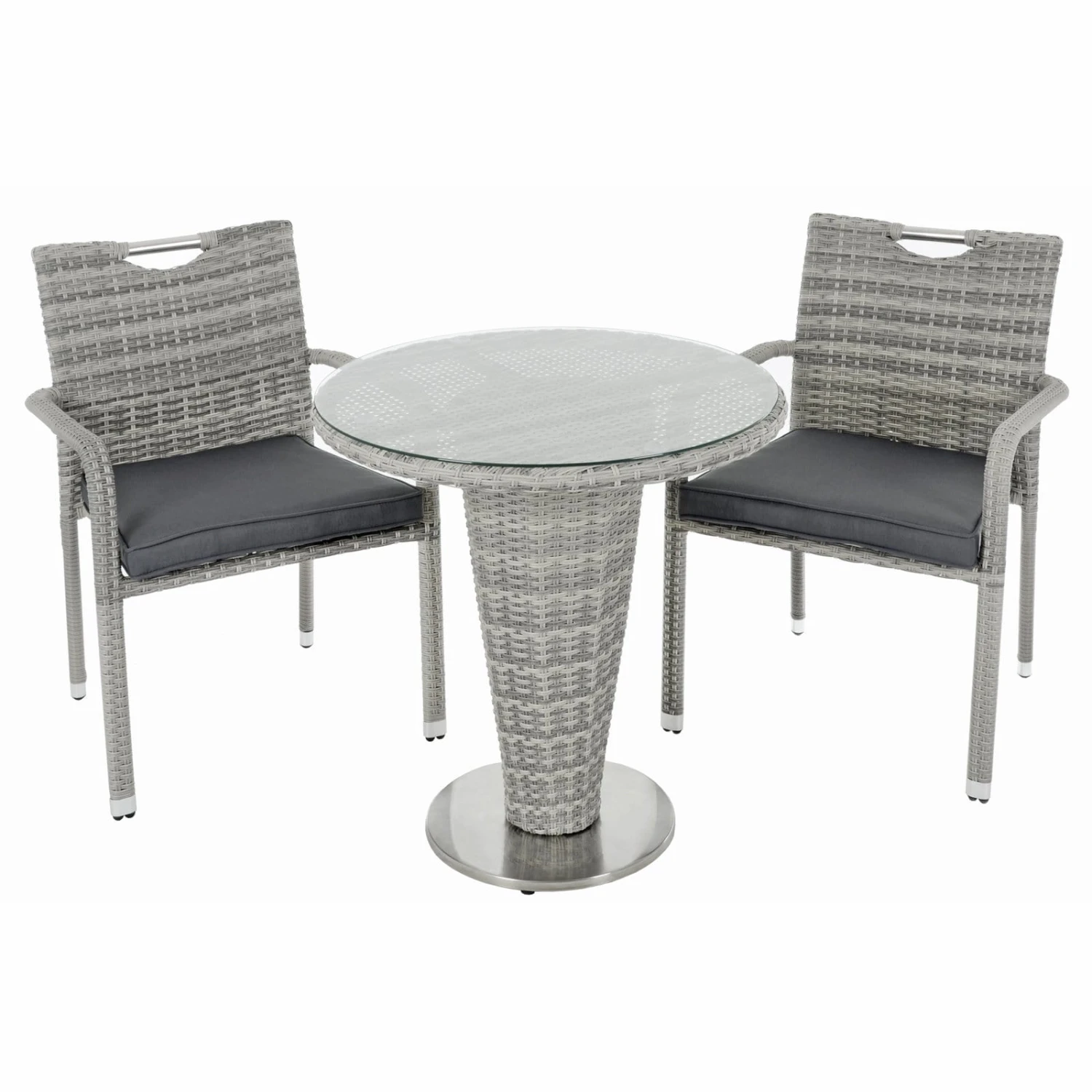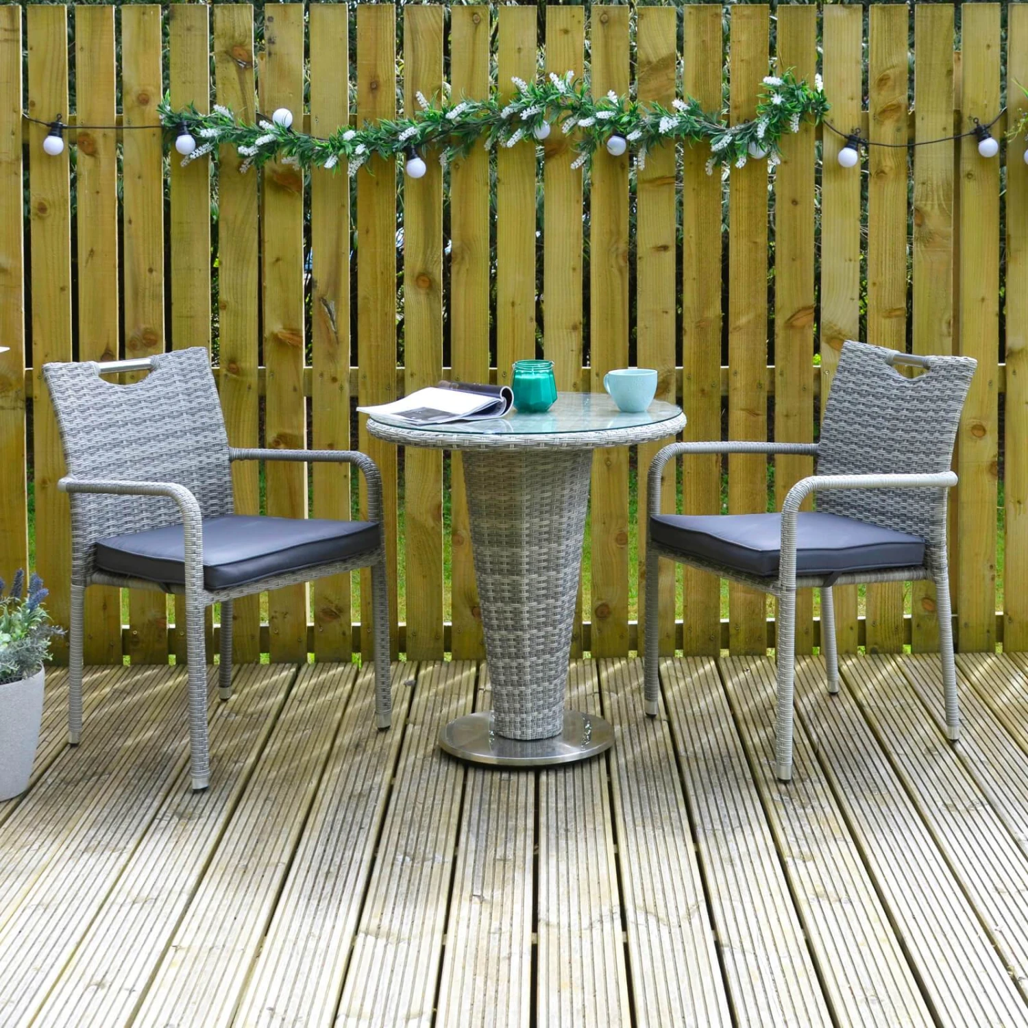 The Cone garden bistro set from Azuma is great for lunch al fresco and relaxing outdoors this summer. The set includes a glass top round table with cone shape rattan and stainless steel base, and two grey rattan chairs. The chairs are stackable to save space when in storage. This eye-catching bistro set garden furniture is perfect for patios, decking, terraces and balconies.