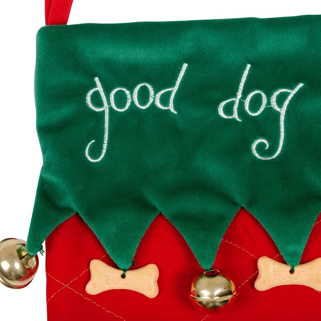 Who said Christmas was just for us humans? Treat your dog to some new toys and snacks on Christmas day, presented in this fun festive stocking. The stocking is made from red quilted effect fabric with a green velvet style collar. Decorated with mini bone ornaments and jingly bells.