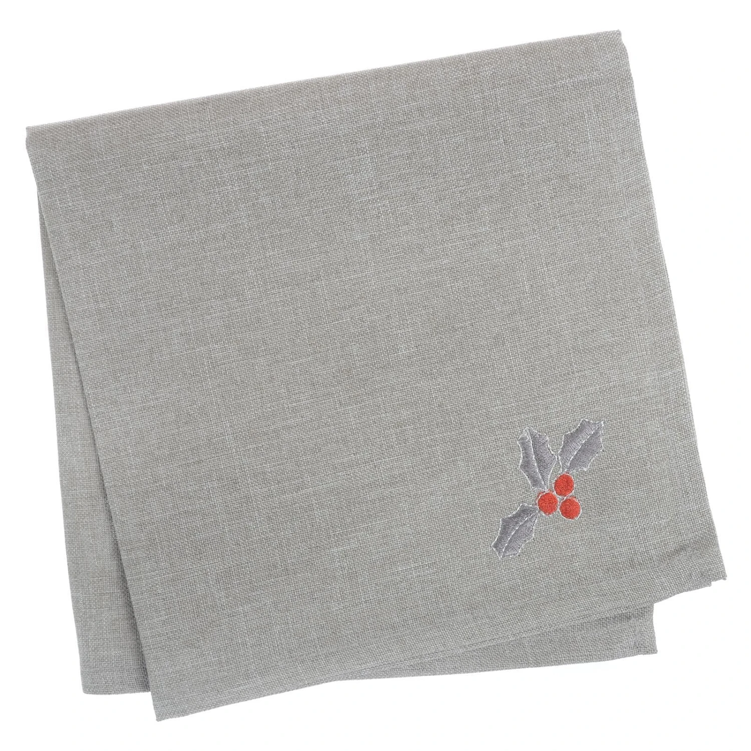 We also have 4 packs of matching fabric napkins that are grey with embroidered holly leaves and berries in one corner. Each napkin measures 16×16″ approx. Great for finishing off a festive table setting. Napkins are sold separately. Choose them from the dropdown menu above and add to your basket.