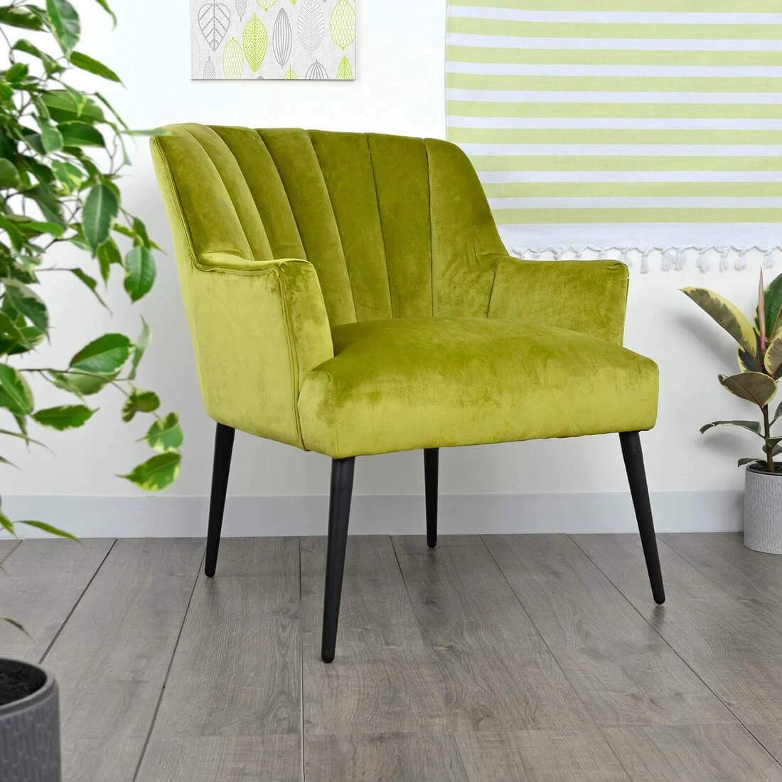 The chair has been finished with black steel legs that have a non-slip base. These chairs will look great sitting next to your favourite coffee table in the living room, in the hallway as a statement piece or as an accent chair for your bedroom.