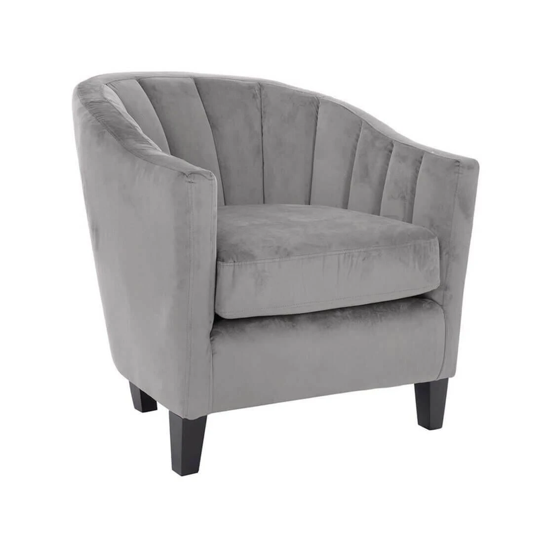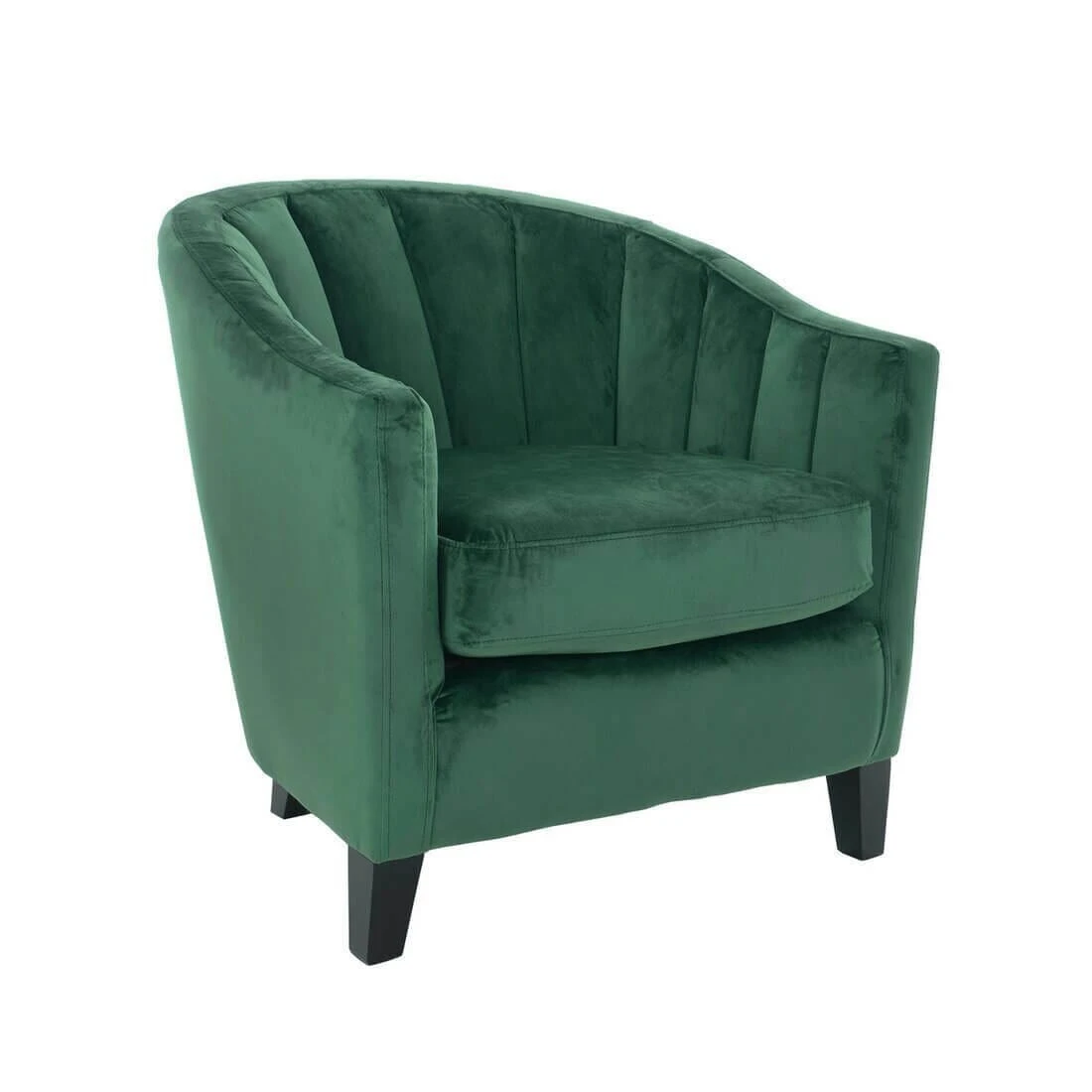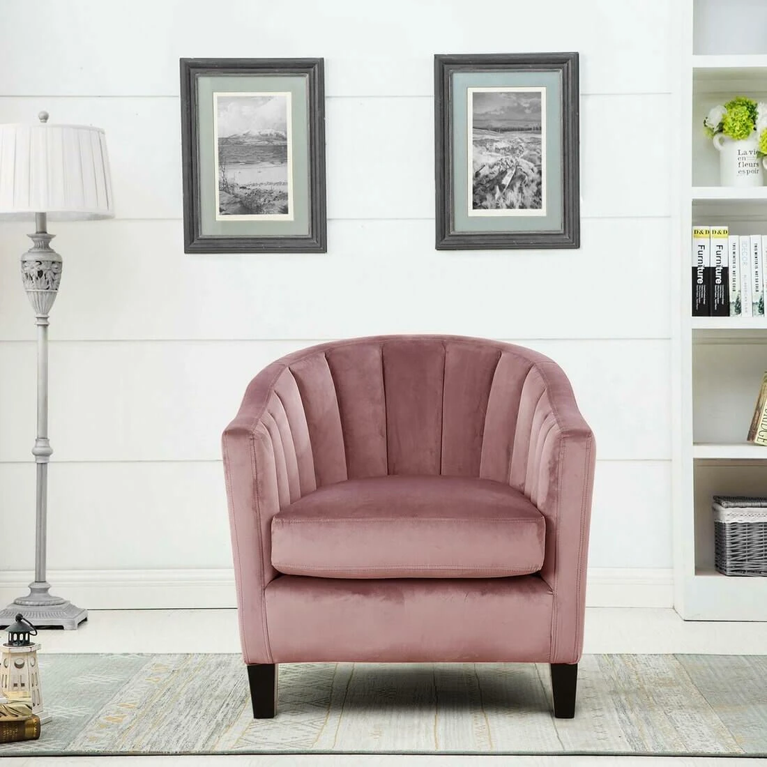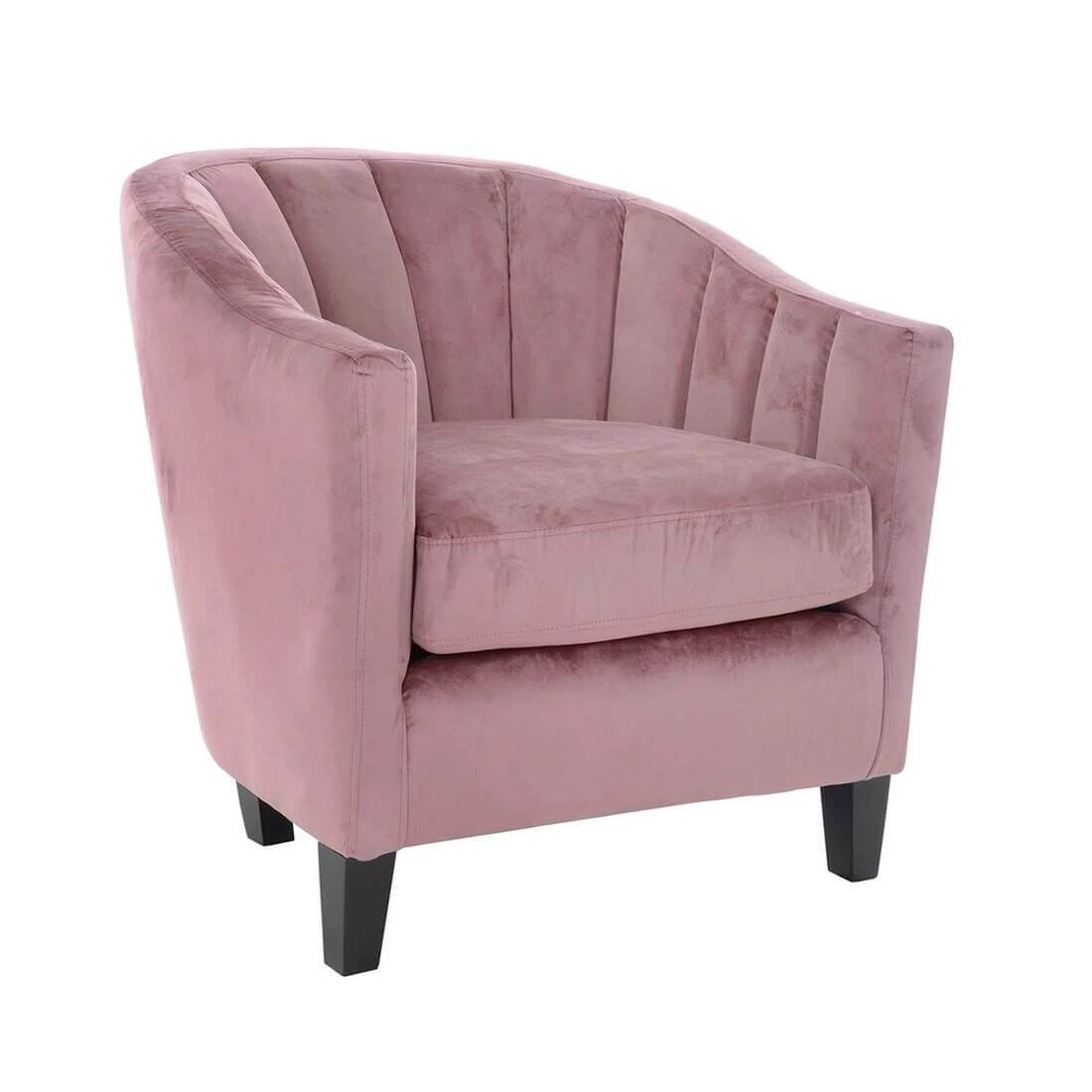 These gorgeous armchairs feature a deep, bowl shaped design with a joining back and armrest. The back of the seat has an embossed shell style stitching and the deep padded seat has been designed to sit low to the ground with dark brown wooden legs to finish.