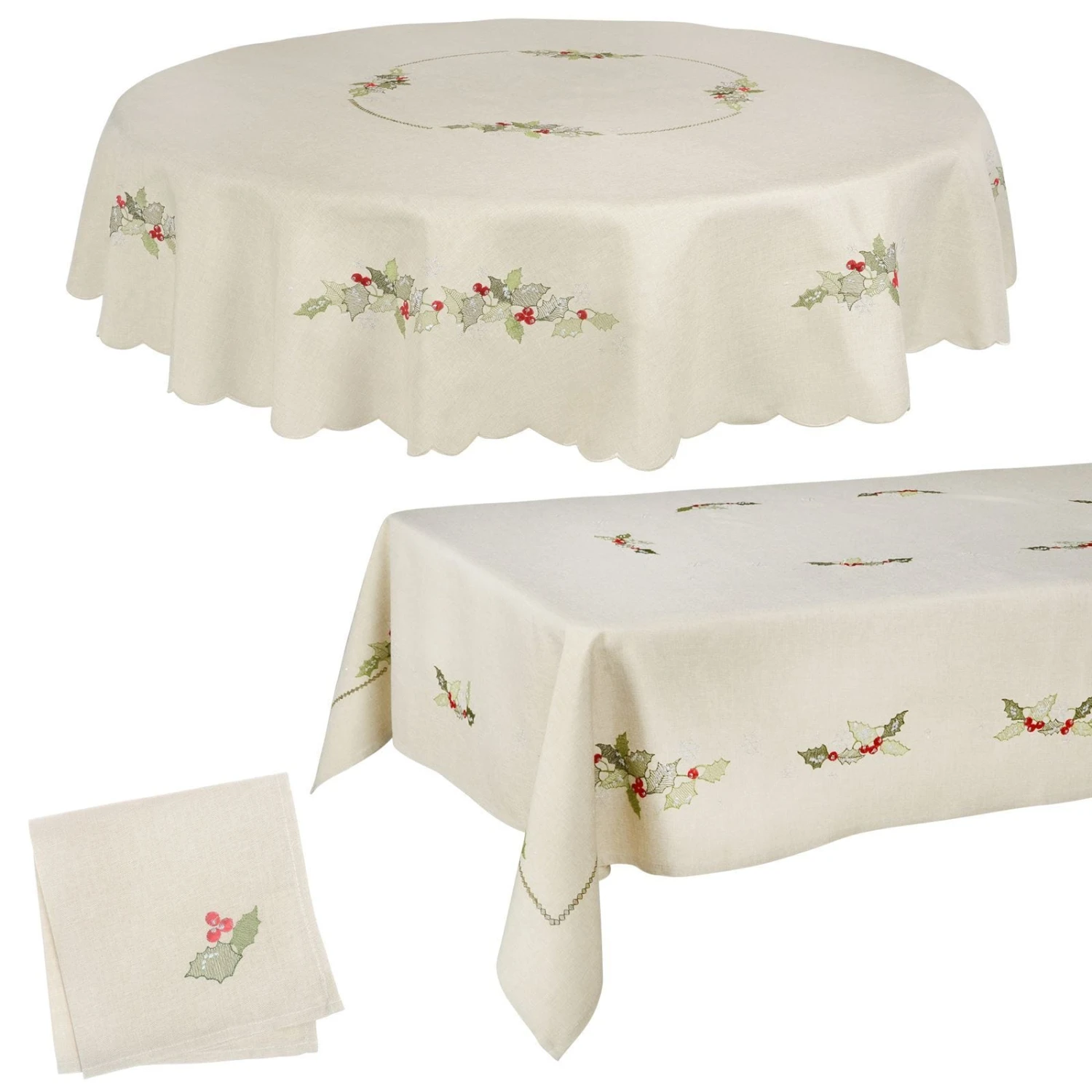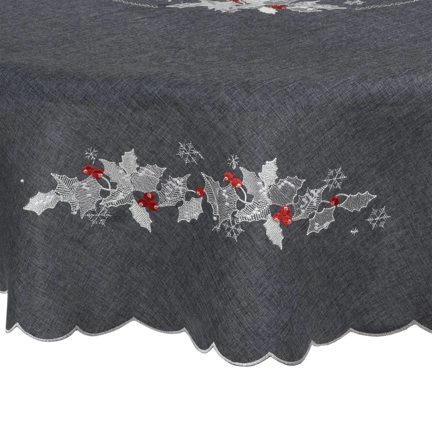 These tablecloths are available in red, dark grey or biscuit with embroidered holly leaves and berries.