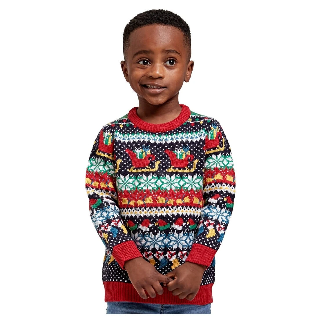 Your little one will love wearing this novelty knit Christmas sweater over the festive period. It features a multi colour Nordic style pattern with snowflakes, fairy lights, santa hats, stockings, sleighs, reindeer and pine tree design. The crew neck Christmas jumper for kids is available in child sizes from age 3 to 12. Perfect for family seasonal celebrations and a great gift idea!