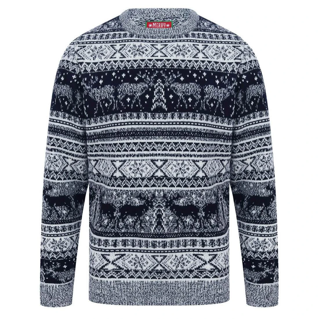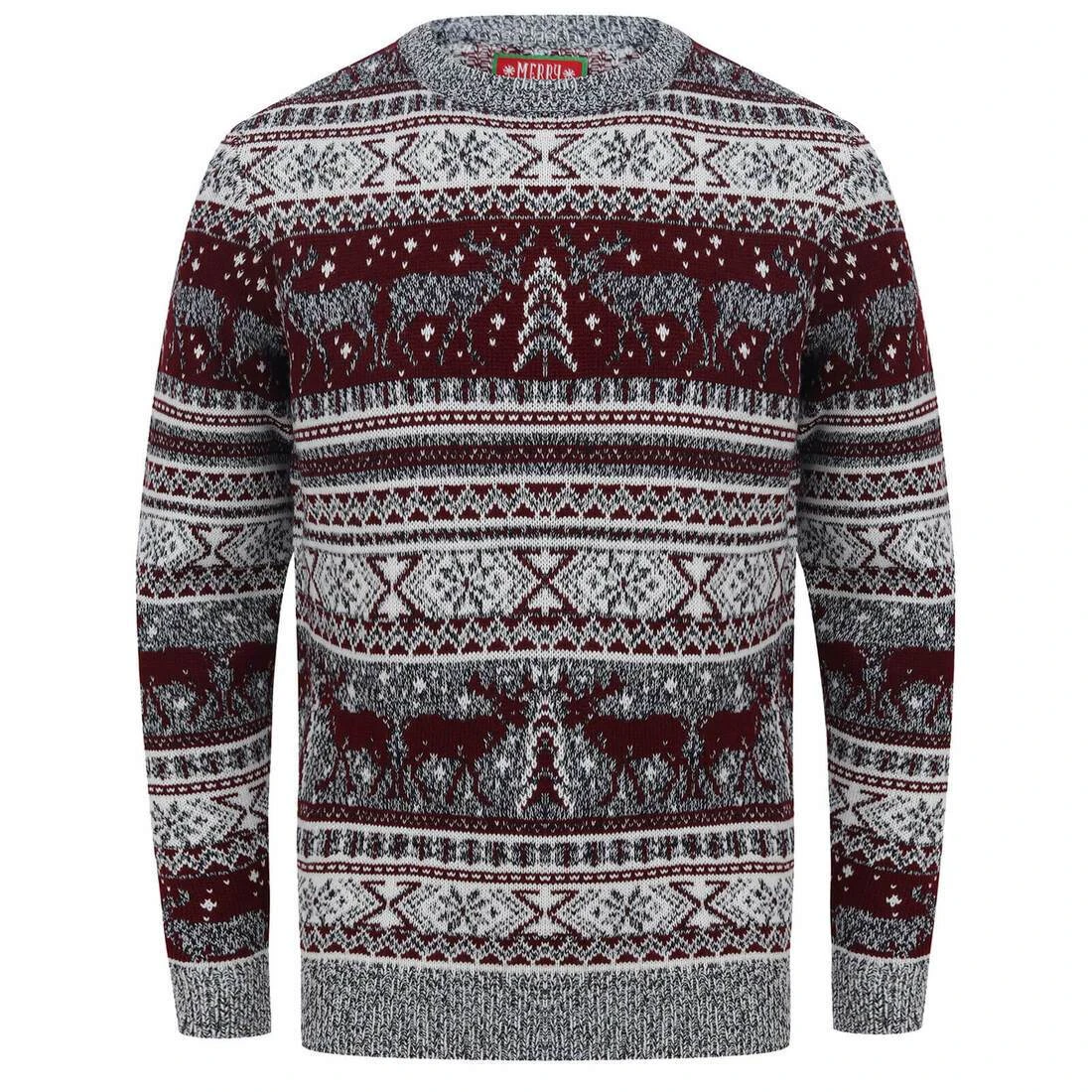 Have fun in this traditional style Christmas sweater. It features a Nordic style pattern with reindeer and snowflake design. The soft knit xmas jumper has crew neck for comfort. This fairisle Christmas jumper is available in dark navy ink or oxblood red colours in mens sizes S, M, L, XL or XXL. Perfect for family seasonal celebrations, office parties and a great gift idea for the man in your life!