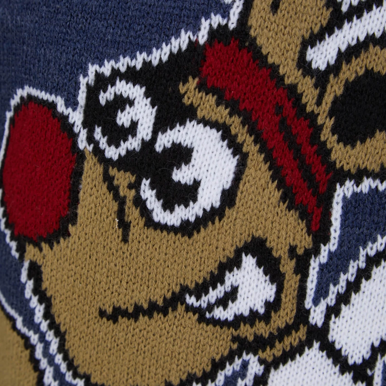Enjoy the festive spirit in this novelty knit Christmas sweater for men. It features a blue background with a reindeer in running shorts, a t-shirt and a sweatband with the slogan “Run Rudolph Run”. This fun Christmas jumper is available in men’s sizes S, M, L, XL, XXL and XXXL. A great gift idea for the man in your life!