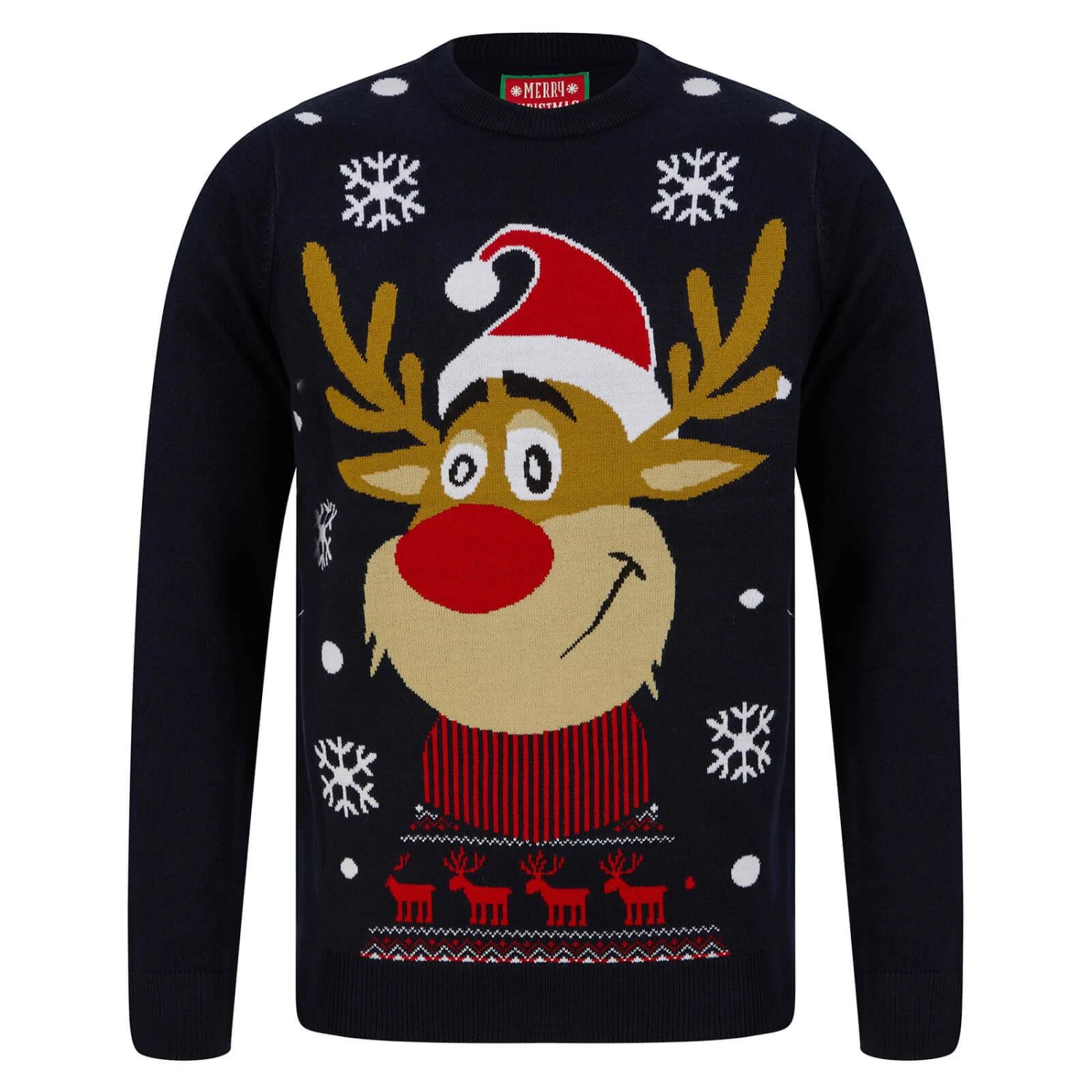 The soft knit, crew neck jumper has a smiling reindeer with a big red nose complete with its own festive jumper with mini reindeer and snowflakes.