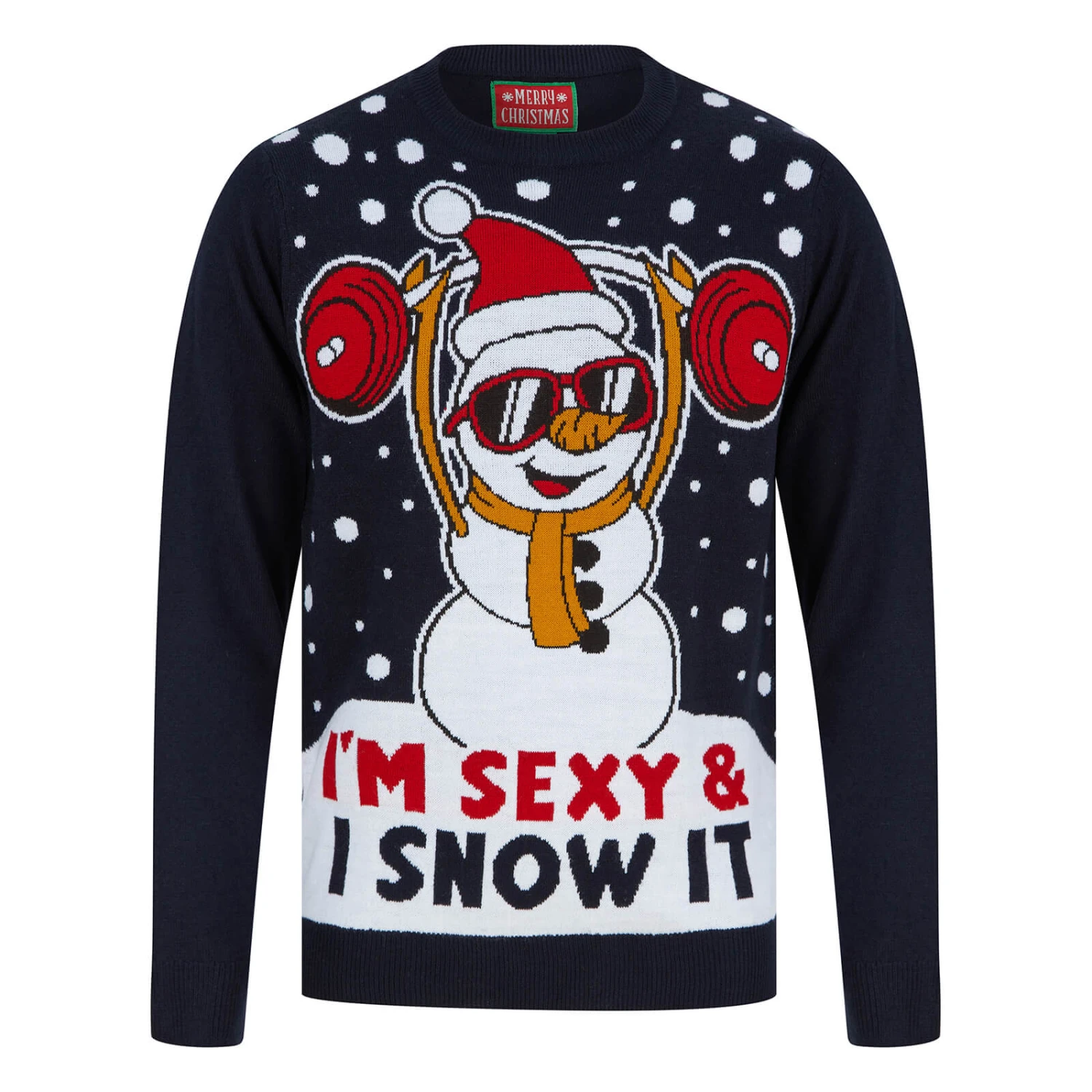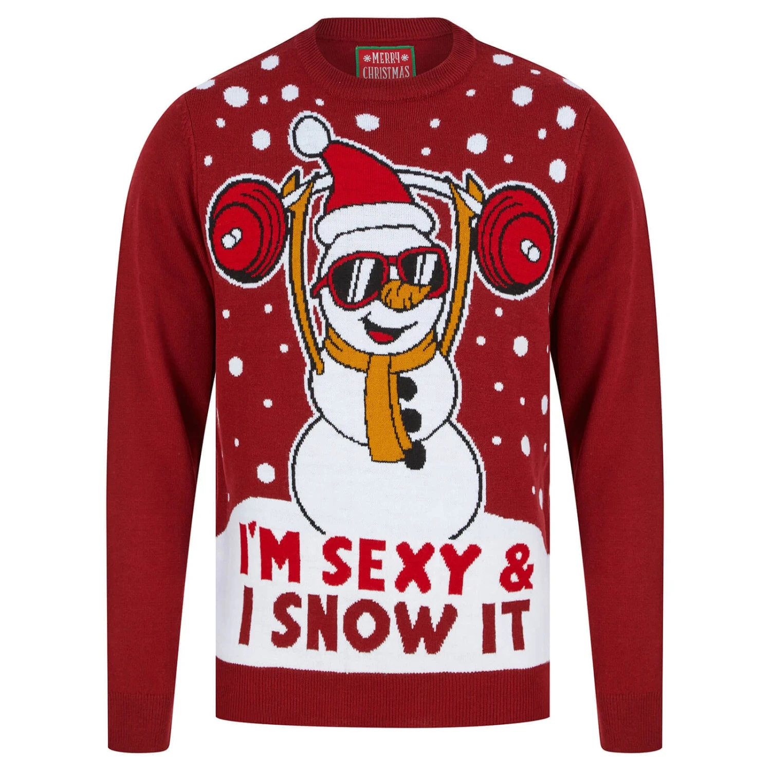 Enjoy the Christmas party in this novelty knit sweater. It features a super strong snowman lifting a weight in the snow with the slogan “I’m sexy and I snow it” Sure to make everyone smile! This crew neck Christmas jumper is available in a choice of Red or Ink and in men’s sizes S, M, L, XL or XXL. A great gift idea for the man in your life
