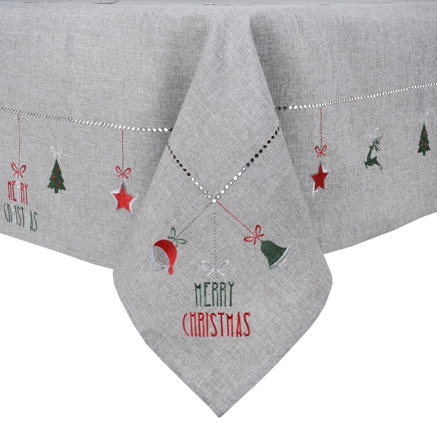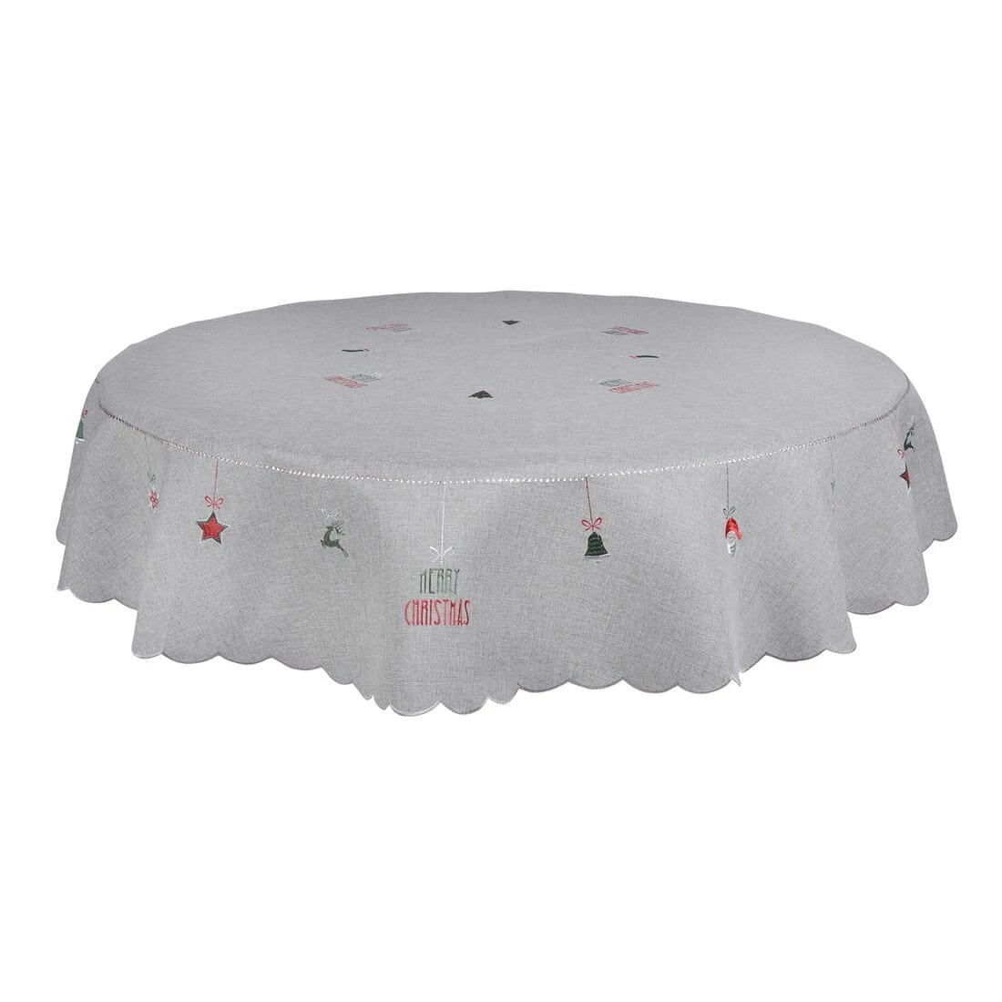These tablecloths are available in grey or white with embroidered red, green and silver “Merry Christmas” text, reindeers Christmas trees and stars.
