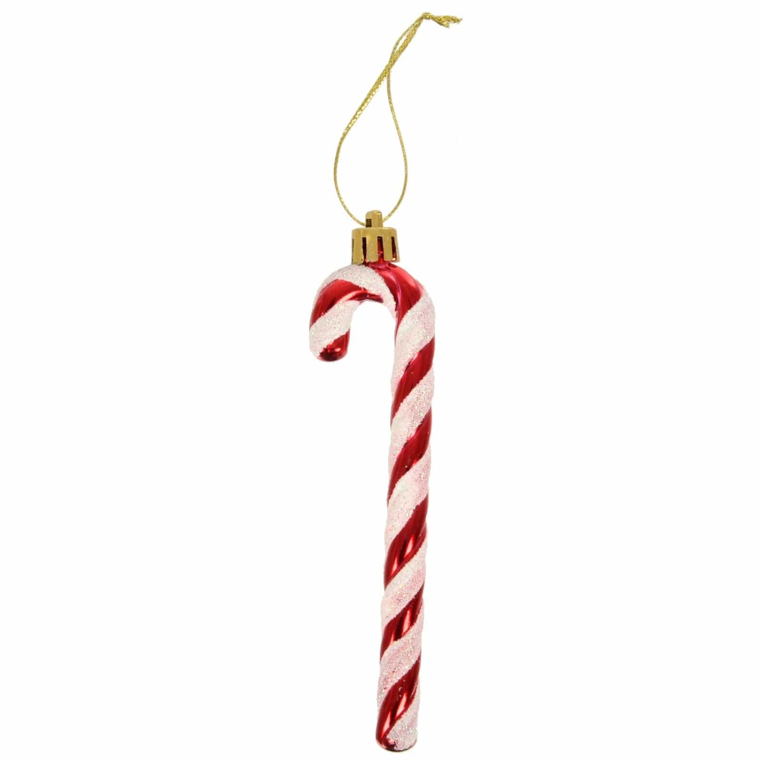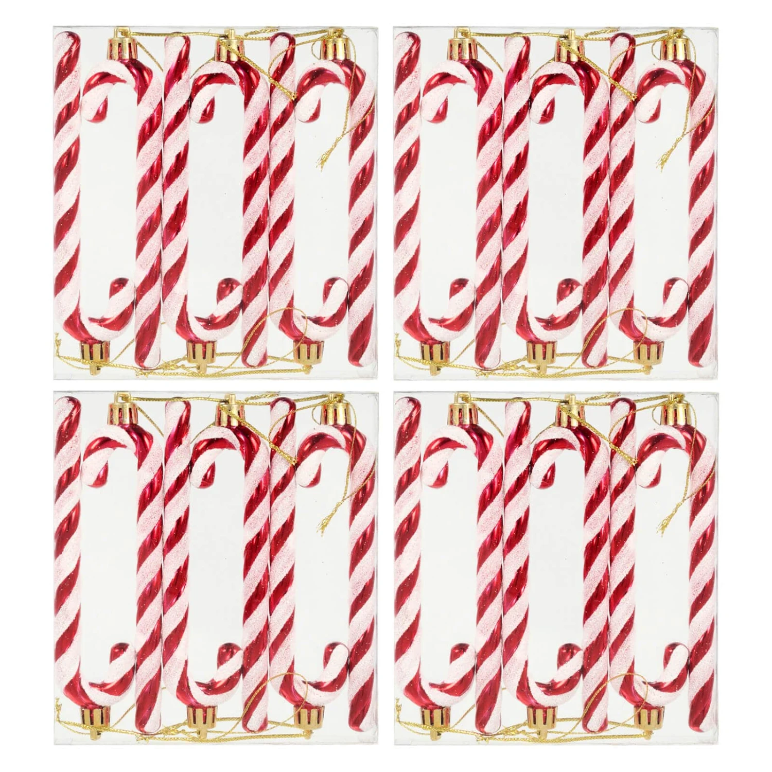 This pack of 24 Candy Cane decorations from Mr Crimbo is a sweet addition to your red and white Christmas theme decor. The classic candy cane shaped Christmas tree decorations have a shiny red and glittering white design with gold caps and string for hanging.