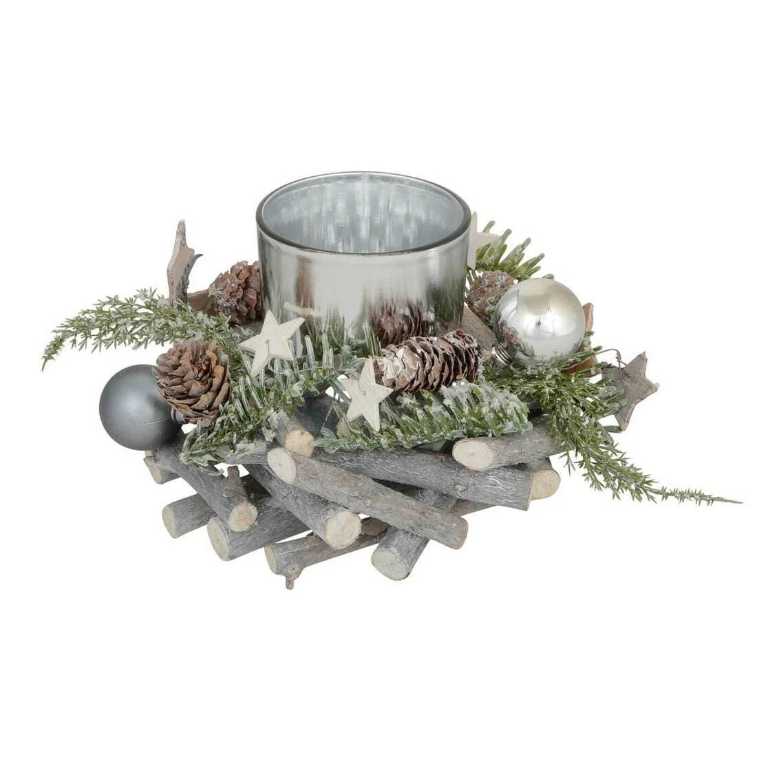 The holder has a round grey wooden stick base that has been decorated with pine cones, wooden stars, silver baubles and mixed green foliage.