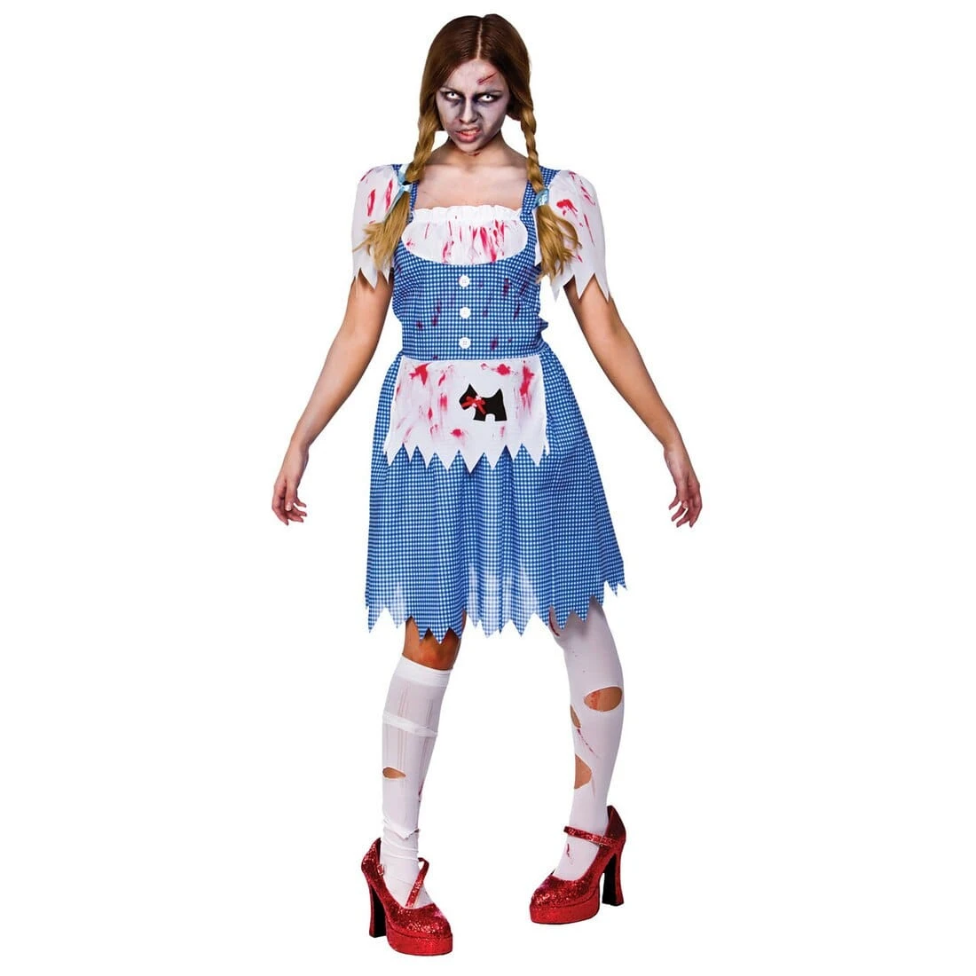 This costume includes a blue gingham dress with blood splatter effect and a white apron with a black dog imprint and blood splatter.